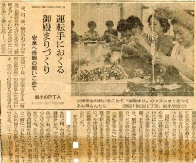 赤、白、黄、緑の色あざやかな糸で花模様を仕上げた小さな”御殿まり”。それにぶらさげた「交通安全」と書いた札-。西淀川区佃一丁目、佃小学校PTAのお母さんたちがいま、学校近くの国道2号を通る自動車の運転手さんにプレゼントして交通安全を訴えようと、運転席に飾るきれいな御殿まりのマスコットをせっせとつくっている。