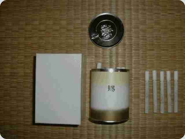 ■缶入り煙草・・・50本入り。1本だけ吸ってみたが、20年以上も前に作られたものだけど、まずいというほどのことでもなかった。天皇陛下(昭和天皇)が吸っておられた煙草だということだが、違うところと言えば、その一本一本に菊の紋が入っていることだけだ。当時親戚らに配ったが、現在まだ11本残っている。